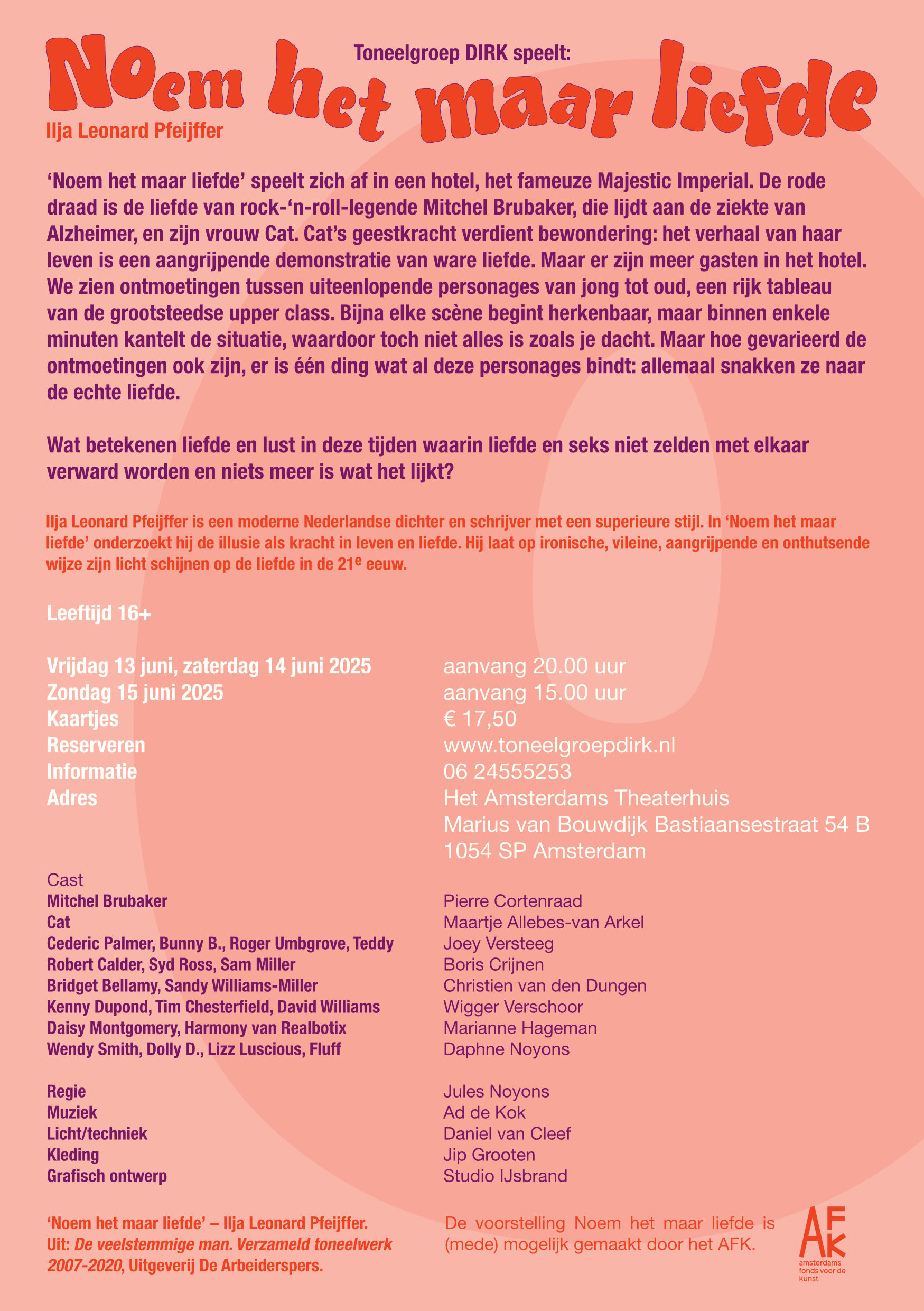 Noem het maar liefde speelt zich af in een hotel, het fameuze Majestic Imperial. De rode draad is de liefde van rock-‘n-roll legende Mitchel Brubaker, die lijdt aan de ziekte van Alzheimer, en zijn vrouw Cat. Er zijn meer gasten in het hotel. We zien ontmoetingen tussen uiteenlopende personages van jong tot oud, een rijk tableau van de grootsteedse upper class. Hoe gevarieerd de ontmoetingen ook zijn, er is één ding wat al deze personages bindt: allemaal snakken ze naar echte liefde.